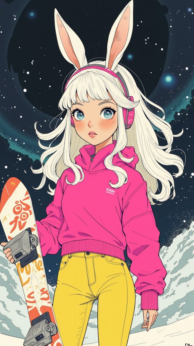 #2. ink drawing, illustration of a young woman in a neon pink oversized sweater and canary yellow leggings, with long wavy white hair and large bunny ears, holding a snowboard in a futuristic setting, dark BG enhances the atmosphere #role_bunny