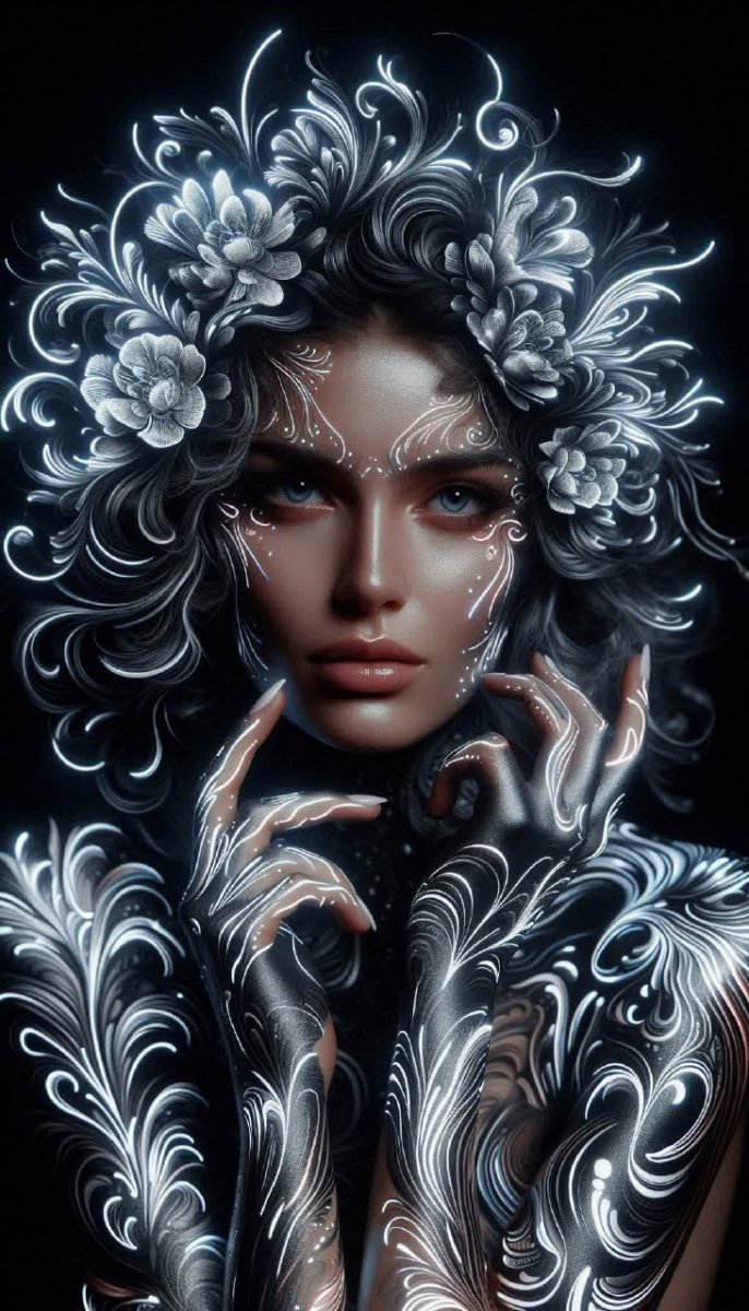 Завораживающая красота девушки, украшенной сложными татуировками в стиле неонового серебра, пленяет взгляд. Изящные узоры, напоминающие текучий свет, переливаются и создают ощущение волшебства. Мастерское использование светотени подчеркивает эмоциональную глубину образа, добавляя драматизма и загадочности. Детализированные абстрактные мотивы цветочных элементов нежно окаймляют лицо, словно оживающие произведения искусства. Тёмный фон контрастно выделяет сияющую кожу и яркие татуировки, усиливая визуальное воздействие. Это портрет, в котором красота и искусство сливаются воедино, создавая мощное впечатление. Каждая линия, каждый оттенок тщательно проработаны, чтобы передать уникальную атмосферу и настроение. Визуальный акцент на деталях татуировок позволяет зрителю погрузиться в мир фантазий и ощутить гармонию между формой и содержанием. Использование техники кьяроскуро придает изображению объемность и реалистичность, делая его особенно привлекательным для ценителей художественного мастерства. Яркий неоновый серебряный цвет татуировок создает эффект свечения, подчеркивая загадочность и неземную красоту девушки. Это изображение - воплощение современной эстетики и искусства тела, сочетающее в себе силу, грацию и неповторимый стиль