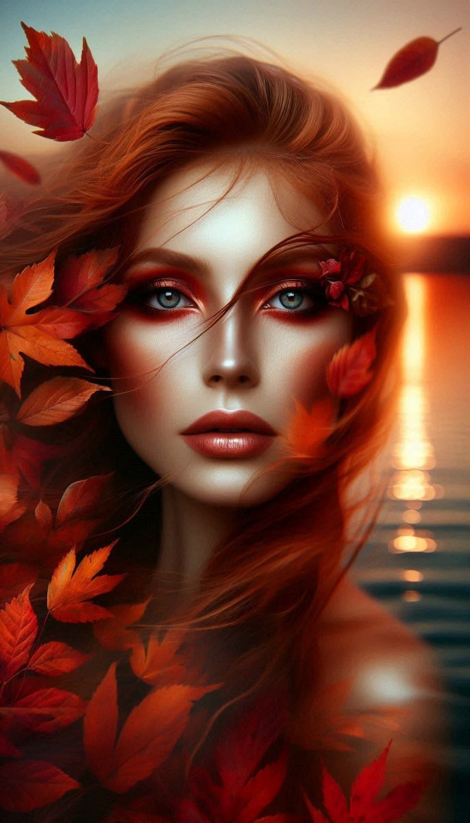#2 close-up portrait of woman, ginger hair flowing, eyes painted with fall colors, warm autumnal feel, surrounded by colorful leaves of red and gold, BG is tranquil lake reflecting orange sunset, capturing serene beauty and ethereal quality, bo-exposure, double exposure, by Igor Morski #role_four_seasons
