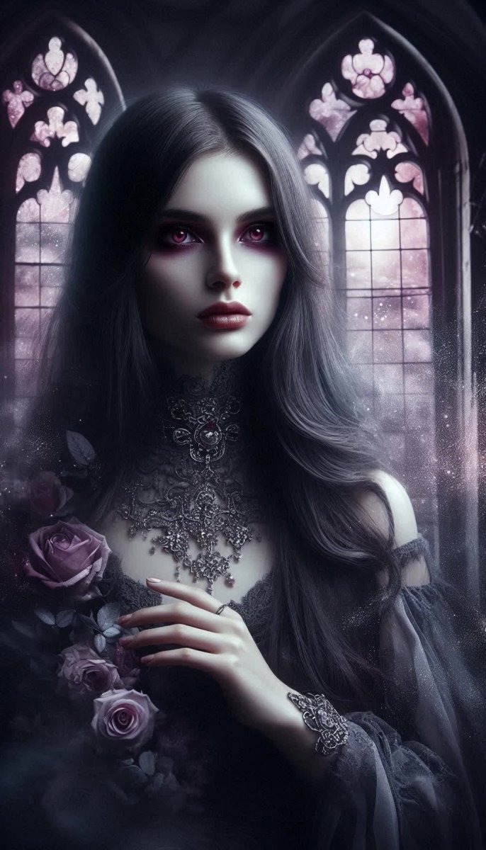 Завораживающая и печальная картина юной вампирши, окутанная мягким лунным светом, проникающим сквозь витражные окна старинного готического замка. Использование двойной экспозиции мастерски объединяет четкие архитектурные элементы с вихрем из аметистовой и серебряной пыли, создавая ощущение потусторонней красоты и тайны. Ее багровые глаза отражают глубокую скорбь и неутолимую жажду вечной жизни, заставляя зрителя ощутить ее одиночество и обреченность. Изысканный кружевной воротник обрамляет бледное лицо, подчеркивая неземную хрупкость ее красоты, а изящные серебряные украшения на тонких пальцах добавляют нотку готической роскоши. Длинные струящиеся черные волосы ниспадают на плечи подобно темной, текучей ночи, усиливая атмосферу мистики и загадочности. Тонкие намеки на увядающие розы, переплетенные в композиции, добавляют мотив бренности и неизбежного распада. Картина выполнена в стиле Густава Климта и Энн Стокс с отпечатком элегантности ар-нуво, демонстрируя виртуозное владение техникой и глубокое понимание эстетики эпохи. Безупречное разрешение 8k и гипердетализация позволяют рассмотреть каждую мелочь, погружая зрителя в мир вечной ночи и готической романтики, где красота переплетается с печалью и таинственностью. Это произведение искусства – настоящая ода мрачной элегантности и вечному очарованию вампирской тематики