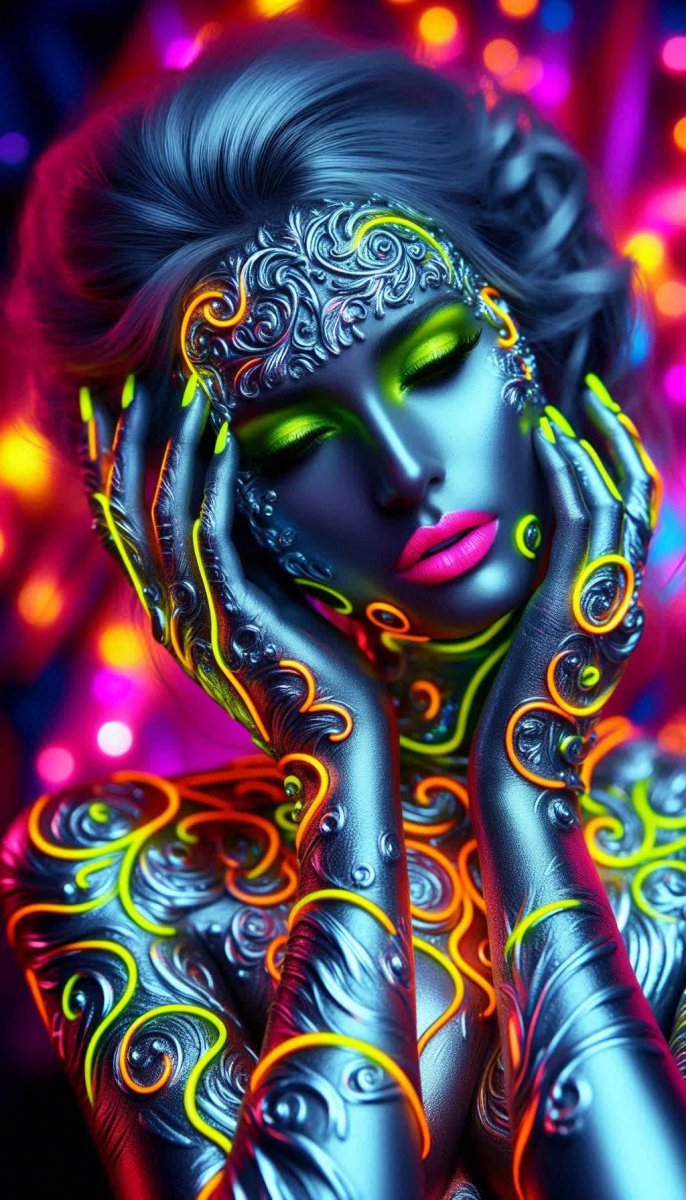 Завораживающая фигура прекрасной женщины, окутанная мерцающими радиоактивными излучателями в серебристом сиянии – это визуальное воплощение эмоциональной интенсивности и очарования. Сложные спиральные узоры, напоминающие текучий филигранный ртуть, создают ощущение таинственности и притягательности. Портрет девушки украшен яркими неоновыми татуировками из блестящего серебра, подчеркивающими её красоту и индивидуальность. Яркая неоновая помада на чувственных губах добавляет образу дерзости и сексуальности. Фон взрывается калейдоскопом неоновых цветов, усиливая общее впечатление от произведения искусства. Это не просто изображение – это захватывающая дух картина, сочетающая в себе красоту человеческой фигуры с футуристическими элементами и глубокими эмоциями. Искусство преображает реальность, создавая мир, где технологии и чувства переплетаются в единое целое, завораживая своей эстетикой и оставляя неизгладимое впечатление. Яркие цвета и сложные детали делают эту работу поистине уникальной, отражая творческий потенциал художника и его умение передавать самые тонкие нюансы человеческой природы через призму современного искусства. Это визуальная симфония света и тени, формы и цвета, эмоций и впечатлений