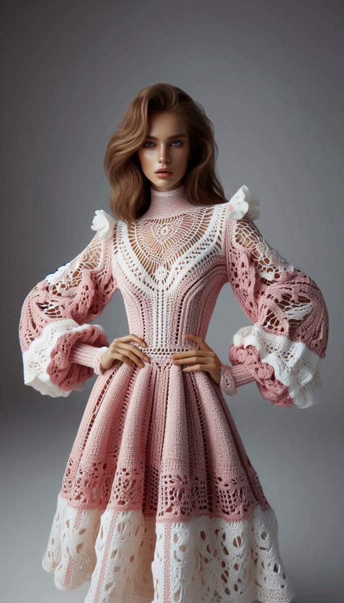 #3 female model, hourglass figure, curvy, voluptuous, ample hips, tiny waist, full bust, shapely body, curvaceous, exaggerated proportions wearing pink and white crochet dress, high neckline, long sleeves with lace detailing, flared skirt falling below knees, posing with one hand on hip, ruffled cuffs, hair styled in sleek updo #role_crochet