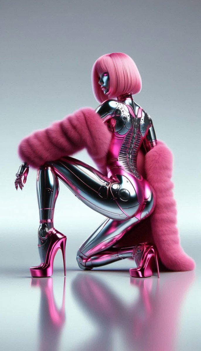 Завораживающий образ футуристической амазонки, сочетающей в себе хрупкую женственность и мощную кибернетическую силу. Детализированная фотография демонстрирует девушку-киборга в дерзком розовом кожаном наряде, состоящем из облегающего комбинезона и откровенного бикини. Она грациозно присела на одно колено, эффектно запрокинув ногу, чтобы подчеркнуть элегантность высоких каблуков. Яркий рейв-стиль одежды дополняет ее необычный образ, создавая атмосферу бунтарства и свободы. Искусство неосюрреализма переплетается с научно-фантастическими мотивами, формируя уникальный визуальный опыт. Металлический костюм и обувь отражают едва заметные блики света, добавляя реалистичности и глубины изображению. Чистый фон позволяет зрителю полностью сосредоточиться на деталях фигуры киборга и ее выразительном взгляде. Композиция передает ощущение уверенности, силы и загадочности, заставляя задуматься о границах человеческого тела и технологического прогресса. Этот образ – яркое воплощение синтеза красоты, моды и высоких технологий в мире будущего, вдохновленное эстетикой Сораямы, известной своими футуристическими изображениями женских тел в металлических костюмах. Безупречная детализация и мастерское использование света создают эффект полного погружения в этот фантастический мир