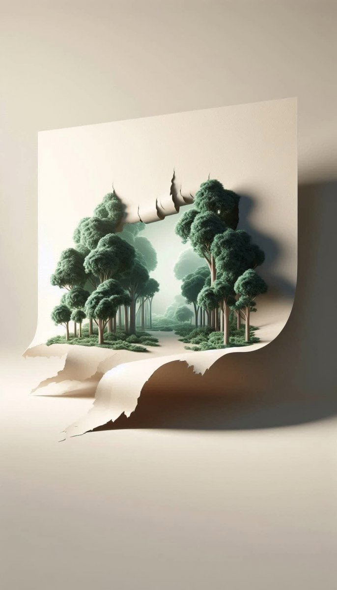 Разорванная бумага и деревья: сюрреалистичная фотография в высоком разрешении - Картинка, созданная нейросетью Dalle
