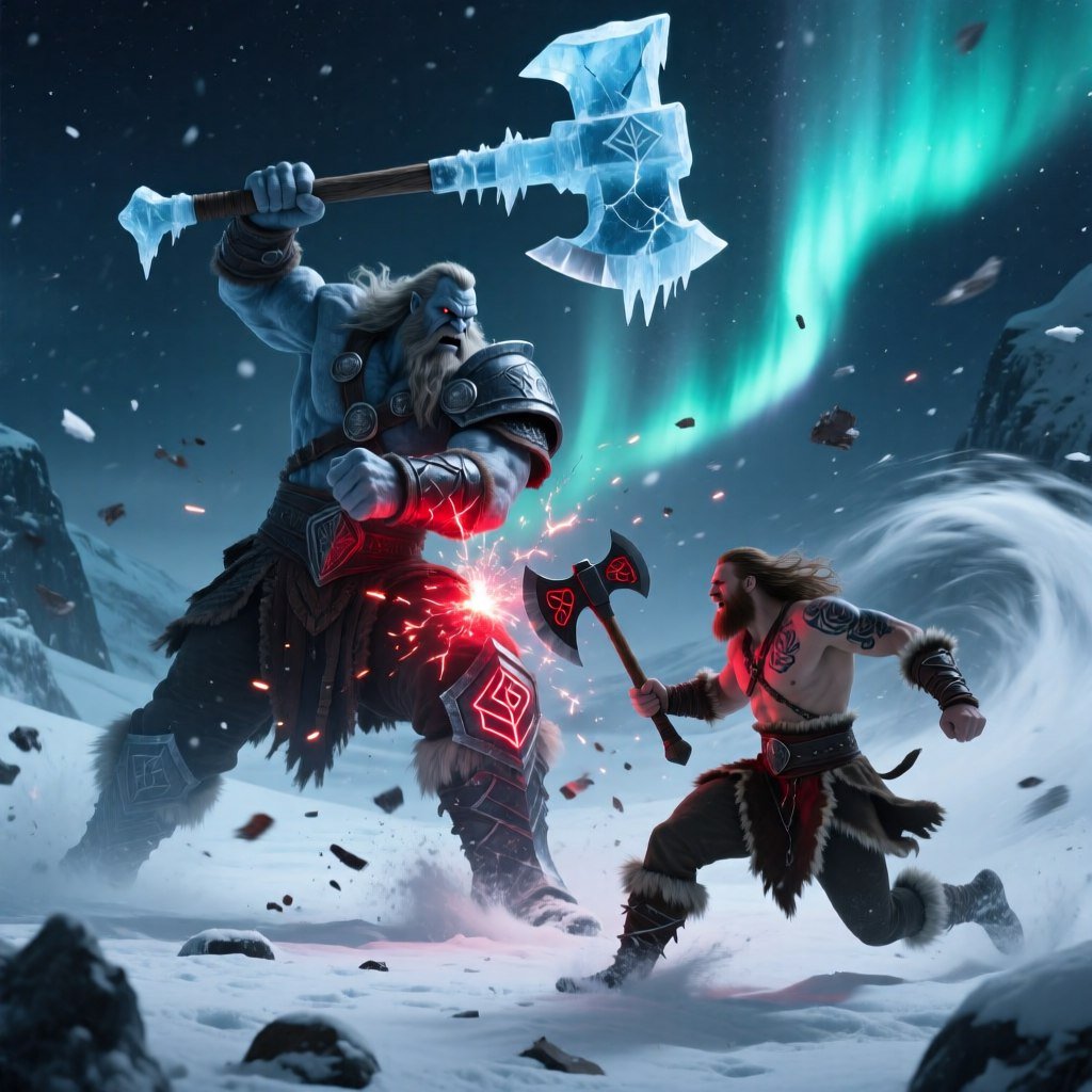 [2] Широкий план: Огромный, ледяной Йотун (30 футов) медленно замахивается массивной ледяной палицей. Берсерк (7 футов) напряжен. Северное Сияние, гиперреализм.