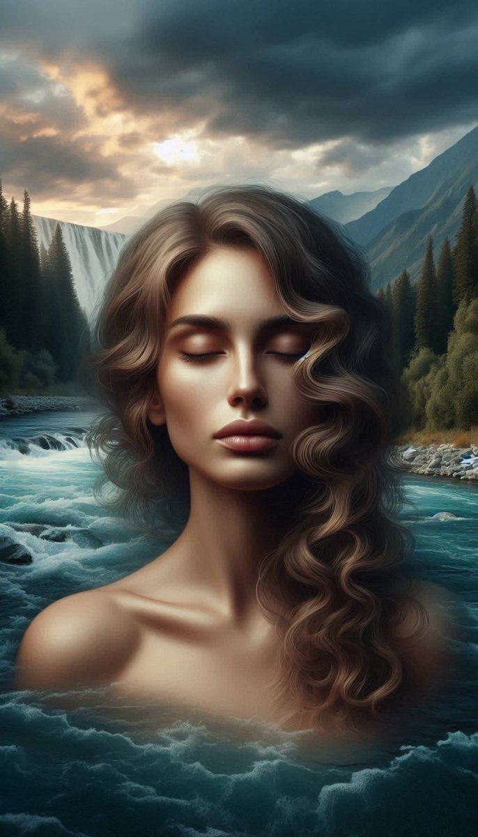 Изящный цифровой портрет женщины, воплощающий спокойствие и умиротворение. Её лицо, обрамлённое волнами распущенных локонов, выражает безмятежную гармонию, глаза мягко закрыты в глубокой медитации. За ней простирается живописный пейзаж: величественная река, окаймленная густыми деревьями и возвышающимися горами, создавая ощущение бескрайней просторы и единения с природой. Композиция выполнена в технике двойной экспозиции, что добавляет изображению глубины и загадочности, словно переплетаются два мира – внутренний мир женщины и окружающая её природа. Свет мягко окутывает фигуру, подчеркивая плавные линии и создавая ощущение воздушности. Общая атмосфера картины пронизана покоем и созерцанием, приглашая зрителя погрузиться в состояние глубокой релаксации и самопознания. Искусство цифровой живописи достигает здесь вершины мастерства, передавая тончайшие нюансы эмоций и создавая запоминающийся образ женщины, слившейся с окружающей средой. Картина словно шепчет о красоте момента, ценности внутреннего мира и гармонии человека с природой. Это не просто портрет, это – состояние души, запечатлённое в цифровом пространстве. Работа представляет собой визуальную поэму, наполненную символизмом и эстетическим совершенством