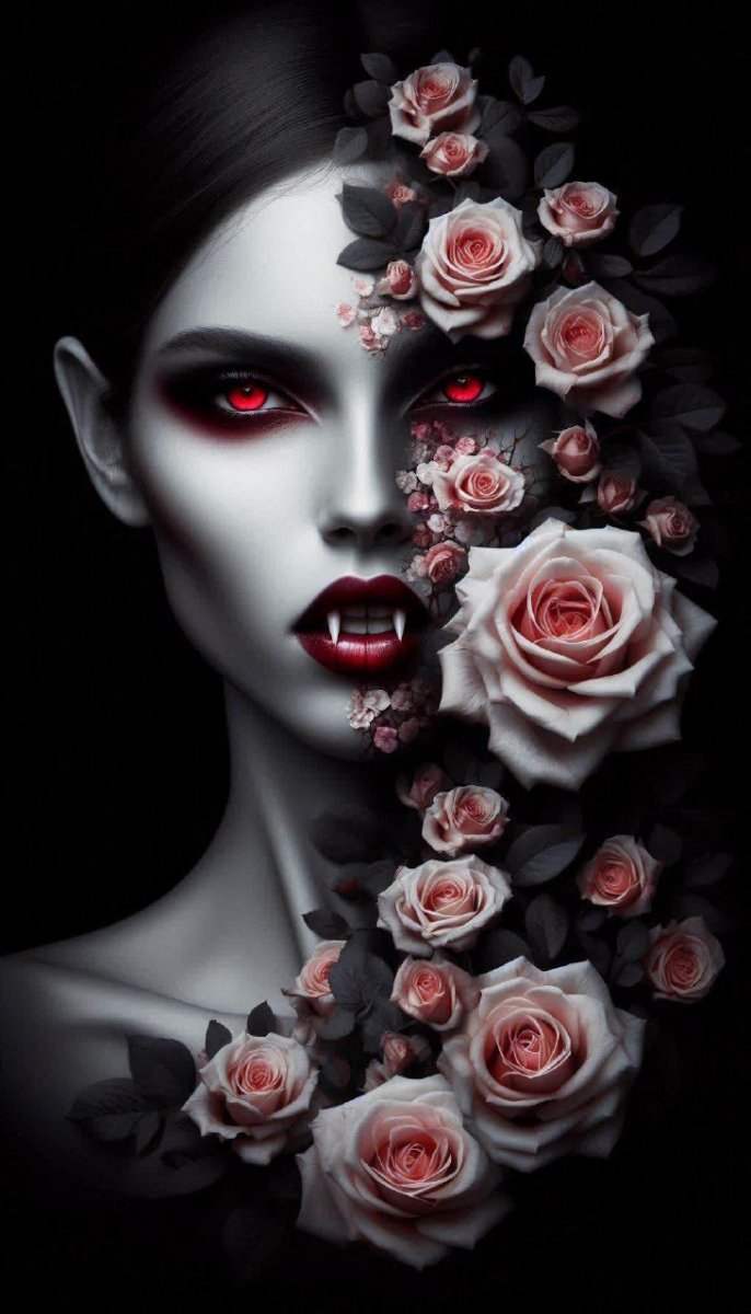 Вампирша и розы: танец страсти и опасности в двойной экспозиции - Картинка, созданная нейросетью Dalle 3