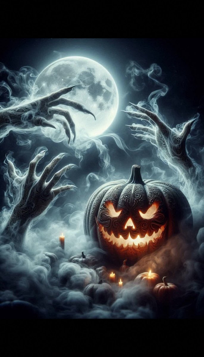 #3. a haunted pumpkin with swirling smoke and phantom hands reaching out, juxtaposed against a full moon, hauntingly beautiful, delicate overlay, high-resolution #role_two_real