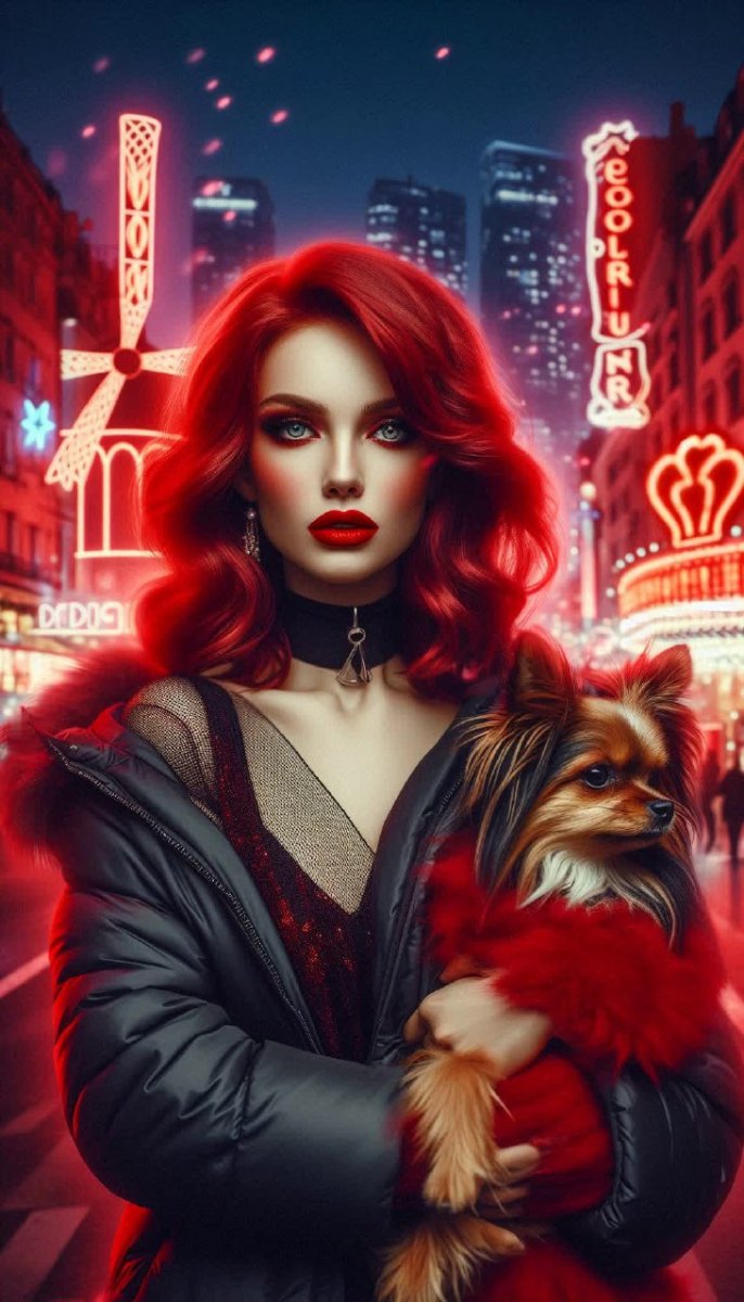 Ночной городской пейзаж в портретном ключе – завораживающее сочетание реальности и фантазии. В центре внимания – роковая красавица вампирша с огненно-рыжими волосами, облаченная в стильную черную пуховую куртку и изящный чокер. Ее алые губы притягивают взгляд, а на фоне ярких неоновых огней красного цвета создается ощущение опасной соблазненности. Неожиданный элемент – она держит в руках хот-дог, добавляющий образу легкую ироничность и отсылку к повседневности, контрастирующую с мистической сущностью героини. Вдохновленный стилем Мулен Руж, образ пропитан атмосферой ретро, но при этом динамичен и современен. Выразительное лицо вампирши передает сложную гамму эмоций – романтику, тайну, легкую грусть и нескрываемое желание. Визуальный стиль картины выполнен в технике двойной экспозиции с наложением абстрактных элементов и текстурами старой пленки, создавая ощущение глубины и многослойности. Графические стрелки добавляют динамики и подчеркивают дерзость образа. Эта работа – захватывающее путешествие в мир темной романтики, где прошлое переплетается с настоящим, а реальность растворяется в мистической атмосфере ночного города. Это не просто портрет, это история, рассказанная языком света и тени