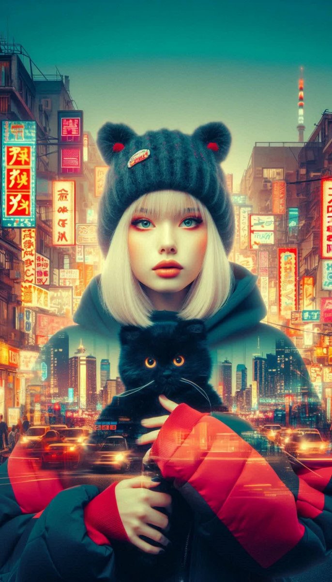 #4. double exposure overlay effect, young cityscape at night with neon signs. blonde in an oversized black and red down jacket, minimalistic makeup, holding a plush black cat. subtle touch of retro texture with layering and set to a grungy soundtrack. a beanie hat with pointed ears. #role_real