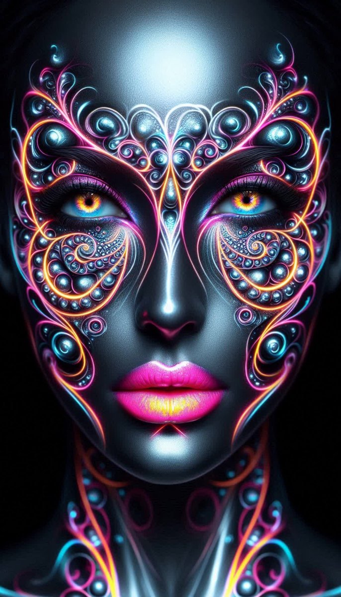#1 portrait of a woman adorned with glowing neon Fibonacci spirals and intricate fractal tattoos, like liquid mercury and polished sterling silver flowing across her skin, her eyes glowing in vibrant neon colors, high precision details, dramatic chiaroscuro, neon lips, pure black background