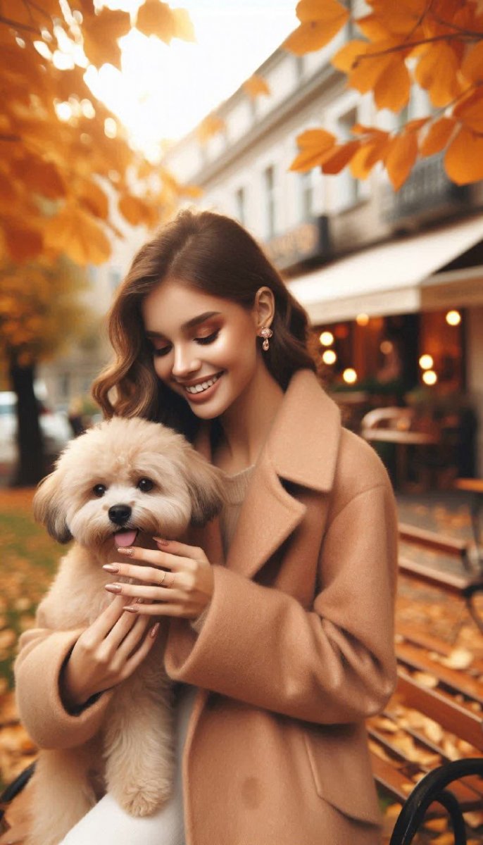 Осеннее настроение: девушка с собакой в парке и уютная кофейня - Картинка, сгенерированная нейросетью Dalle