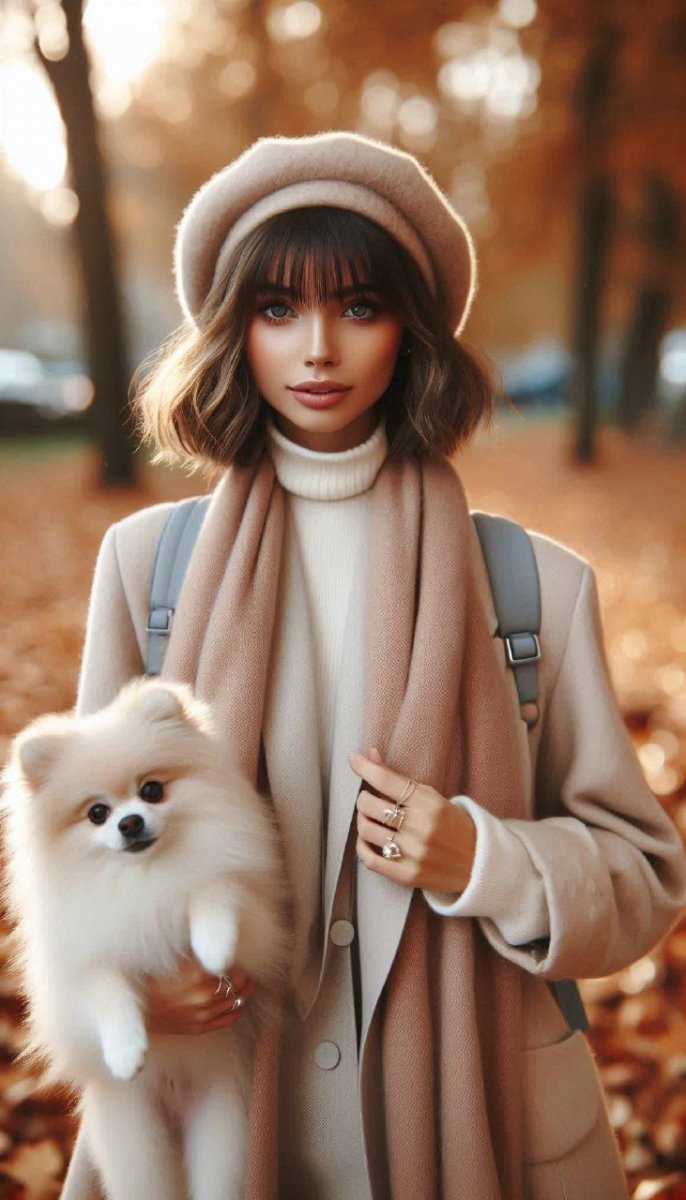#4. девушка с короткой челкой, зачесанной вверх, стильный образ в повседневном стиле: толстое светло-бежевое пальто, уютный шарф в коричнево-бежевых тонах, лёгкий базовый костюм, мягкая шапка, небольшой рюкзак за спиной, минималистичные кольца на руке, тёплый нюдовый макияж, держащая поводок с пушистым белым шпицем на нём, фон — яркие опавшие листья, мягкие отражения света на мокром тротуаре, двойная экспозиция, наложение #role_autumn