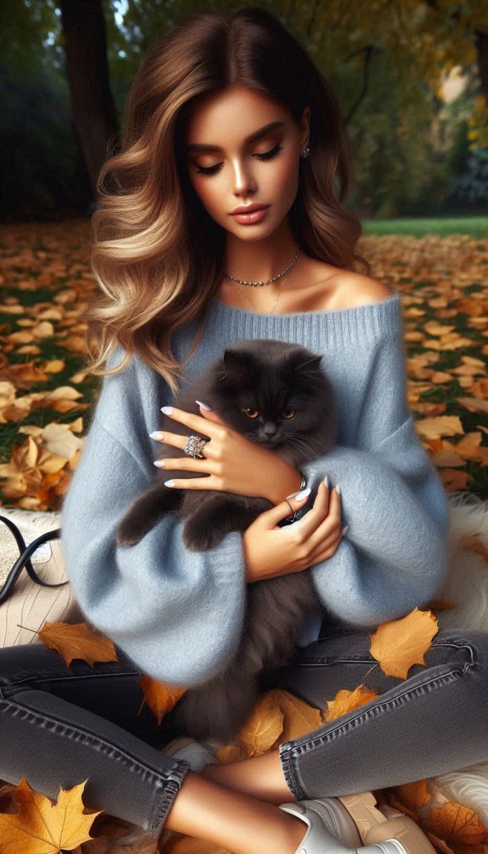 #1. девушка в уютном осеннем парке, casual стиль: объемный светло-синий свитер, серые джинсы, стильные минималистичные украшения, аккуратный маникюр, натуральный макияж, на коленях пушистая черная кошка, редкие желтые листья вокруг, атмосфера спокойствия и уюта, двойная экспозиция #role_autumn