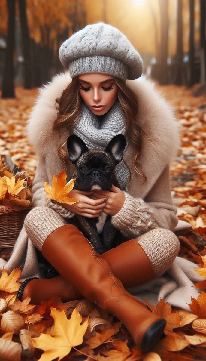 #5. профессиональное фото, девушка в уютной шапке и длинном светлом пальто, casual стиль: мягкий шарф, коричневые ботинки, объемный свитер, на руках милый французский бульдог, яркие оранжевые листья медленно падают, атмосфера тепла и свежести, двойная экспозиция #role_autumn
