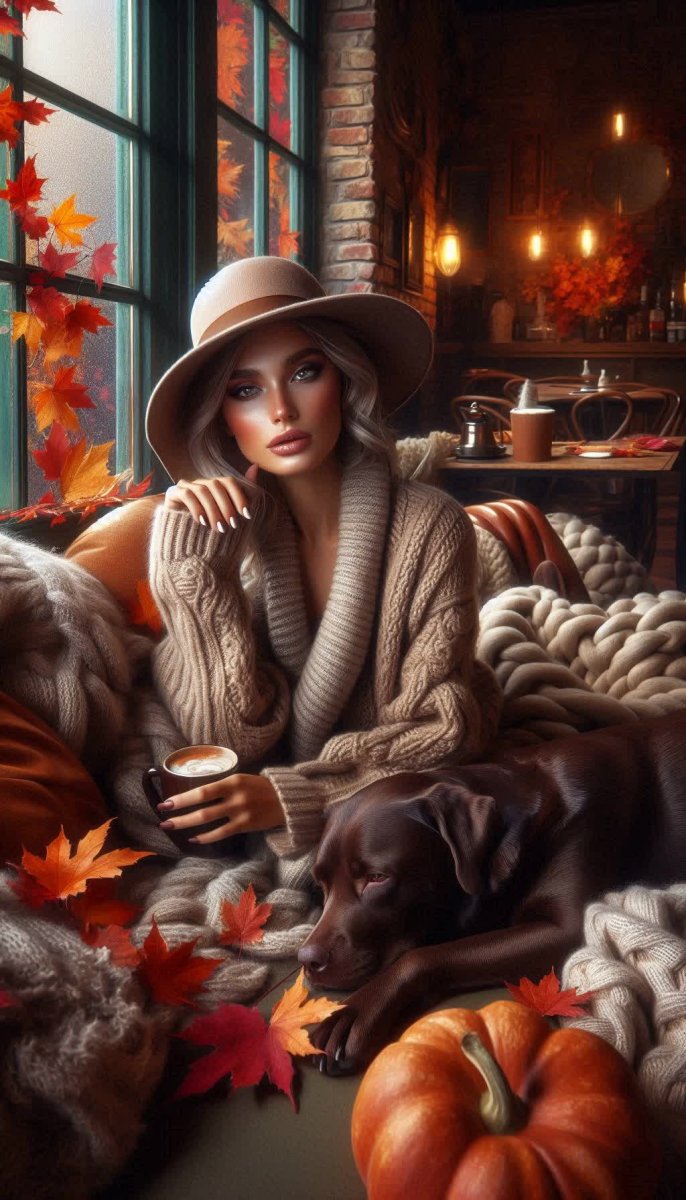 #2. осенний вечер в кафе, девушка в стильном кардигане, множество мягких пледов, на коленях шоколадный лабрадор, светло-коричневая шапка, аккуратный маникюр, makeup в теплых тонах, за окном опадающие листья, атмосфера романтики и тепла, двойная экспозиция #role_autumn