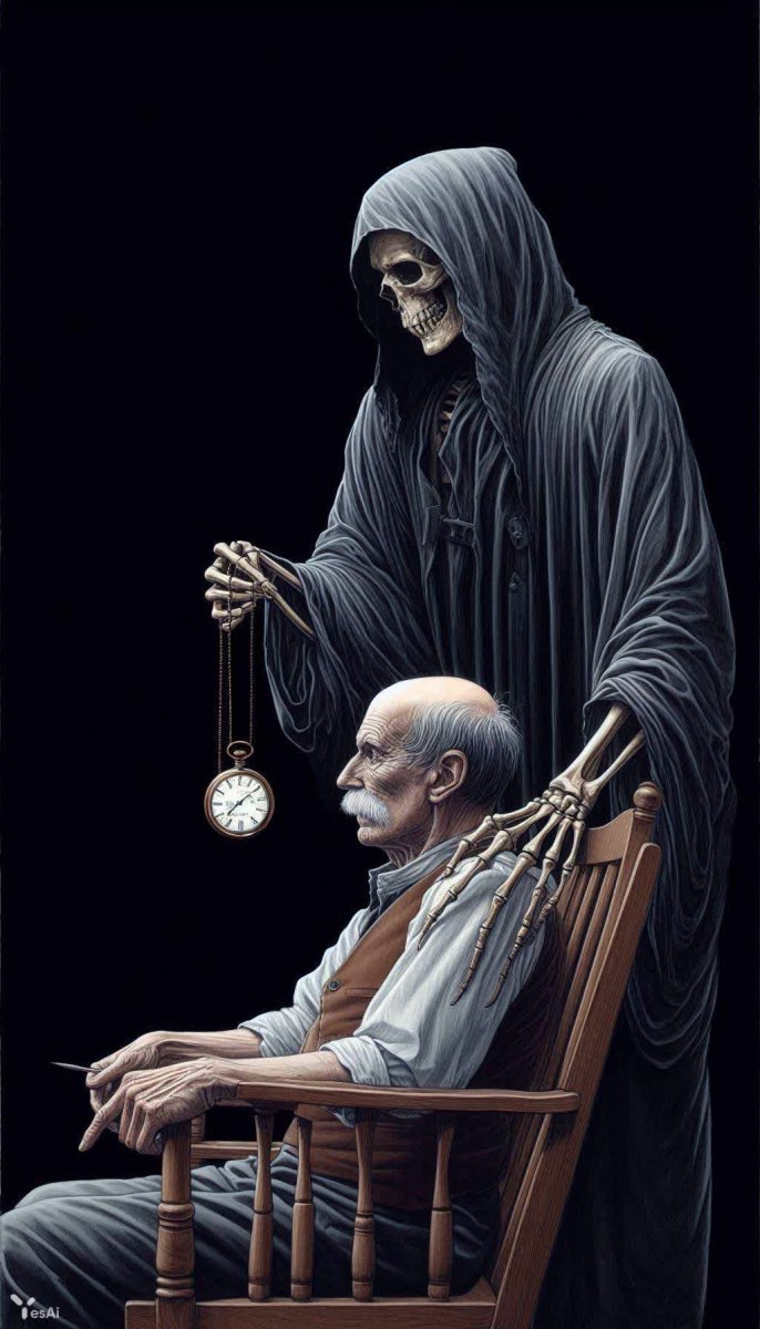 Мрачная и проникновенная сцена, пронизанная ощущением неотвратимости времени и сожаления о прожитых годах. В центре композиции – старик, восседающий на стуле, его поза выражает усталость и смирение перед лицом надвигающейся участи. Его взгляд, полный печали и раскаяния, обращен к карманным часам, которые словно символизируют утекающее время и упущенные возможности. За спиной старика возвышается жуткая фигура скелета в черном одеянии – безмолвный свидетель конечности земного существования, его рука, нежно лежащая на плече старика, одновременно выражает сочувствие и неизбежность. Другая рука скелета крепко удерживает карманные часы на цепочке, подчеркивая важность момента и невозможность повернуть вспять ход времени. Фон выполнен в насыщенных темных тонах, создающих атмосферу таинственности и меланхолии, усиливающую драматизм происходящего. Композиция выдержана в строгом стиле, вдохновленном работами культового художника Дэйва Гиббенса, известного своей детализированной проработкой персонажей и умением создавать атмосферные изображения с глубоким психологическим подтекстом. Картина вызывает размышления о бренности бытия, важности каждого мгновения и неизбежности встречи со смертью. В ней переплетаются темы памяти, сожаления и принятия своей судьбы, создавая мощный эмоциональный отклик у зрителя. Это не просто изображение, а философская притча о жизни и смерти, представленная в мастерской визуальной форме