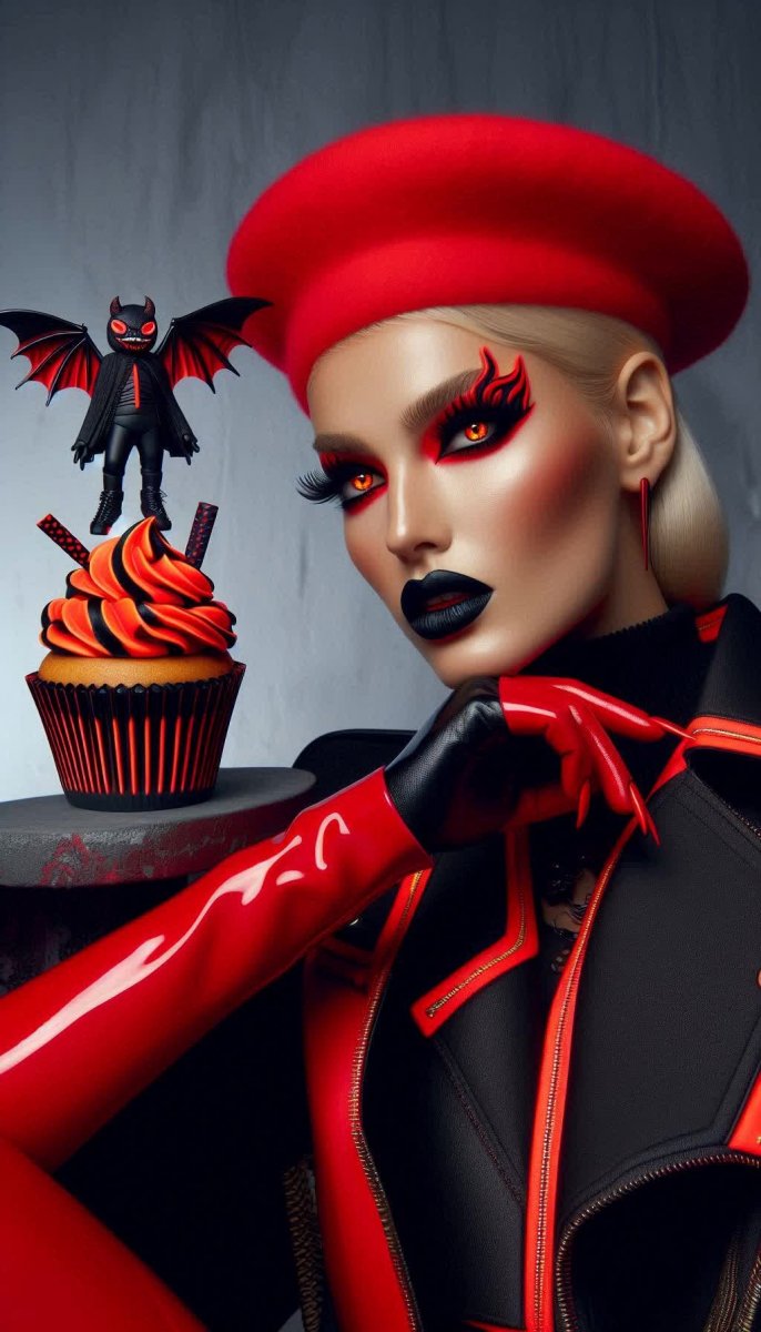 #4. блондинка в чёрно-красном неоновом костюме с красными ботинками и массивным хокером, яркий макияж: чёрные графические стрелки и алая помада, на голове - красный берет, рядом демонический кекс с крыльями летучей мыши. профессиональное фото, белое балансирование #role_real