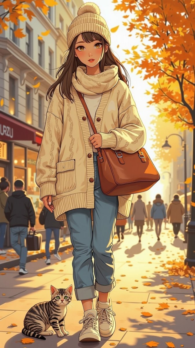 #5. осенняя фотография, девушка в уютном вязаном кардигане кремового цвета и джинсах, повседневный стиль: удобные кроссовки, большая сумка через плечо, аккуратный маникюр с градиентом, естественный макияж с легким сиянием, на голове теплая шапка-бини, рядом спит маленький котенок полосатой расцветки, фон - осенний город с золотыми листьями и мягким светом уличных фонарей, двойная экспозиция #role_autumn