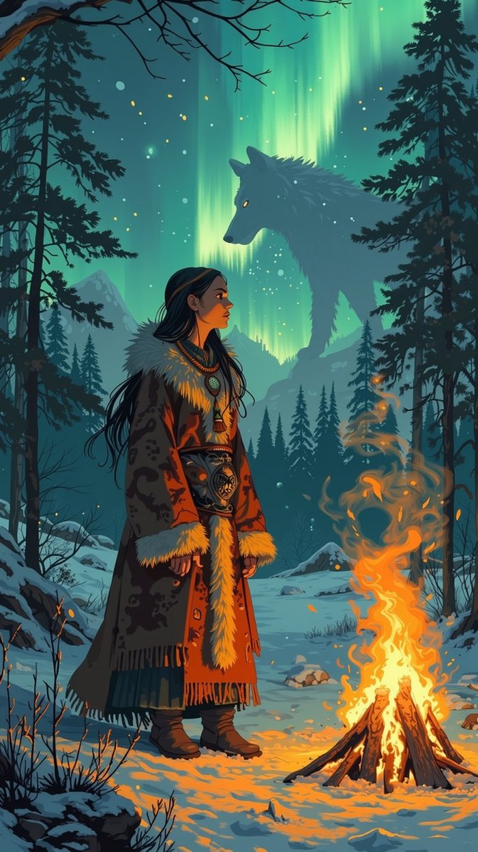 #5. видение шаманки: шаманка в традиционном одеянии из шкур животных стоит у костра под северным сиянием, её лицо освещено пляшущими языками пламени. она заглядывает в дым, словно видя будущее. на шее - амулет с изображением волка. вокруг - лес, покрытый инеем, и силуэты танцующих духов. эффект ghosting, зернистость пленки, монохромная палитра с оттенками синего и оранжевого, white balance fluorescent, shutter speed 1/80, film grain, high iso, Polaroid photo. #role_vamp