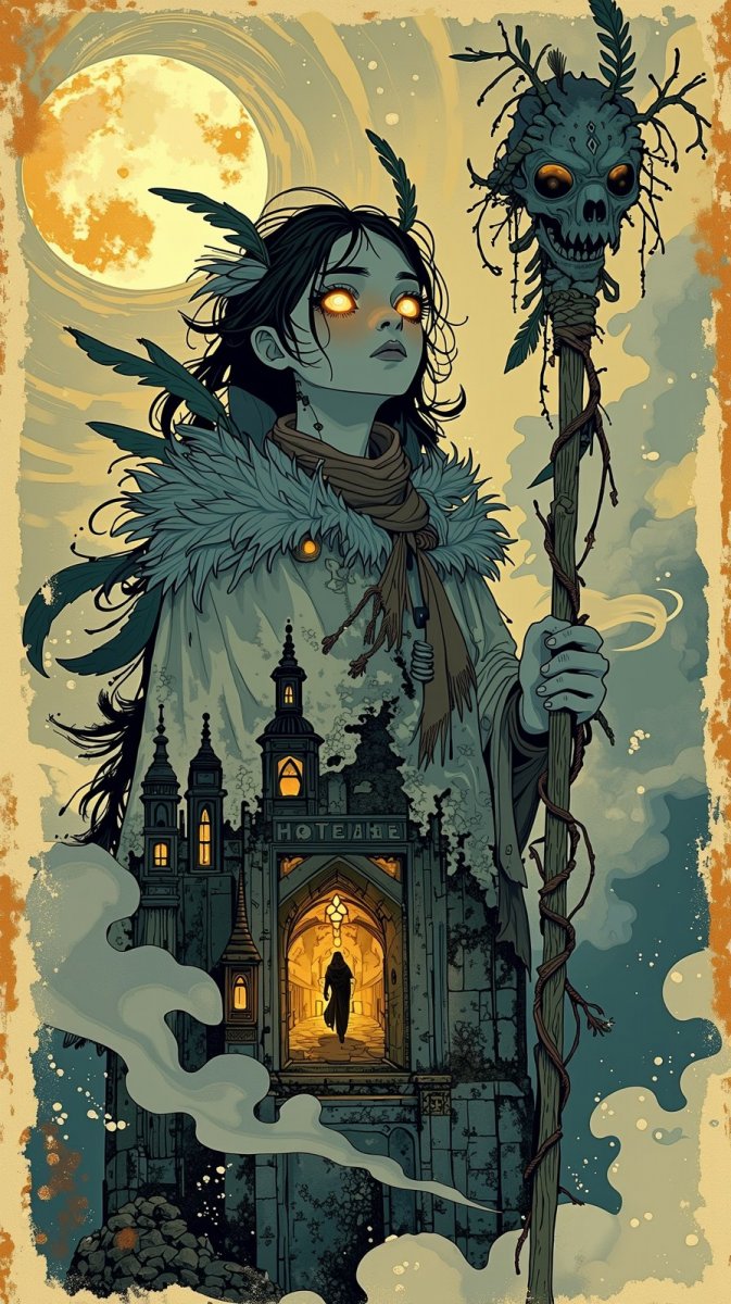 #1. старинная фотография с эффектом царапин и пыли, двойная экспозиция: шаманка с лицом, будто выточенным из лунного камня, в истлевшей меховой накидке, украшенной костями и перьями, сквозь её фигуру проступают вихри тумана цвета чернил и изображение полуразрушенного каменного круга под зловещим кровавым месяцем; глаза – два озера расплавленного золота, в руках она держит посох из обугленного дерева, обвитый светящимися лианами, на заднем плане – заброшенный склеп с выщербленными барельефами и мерцающими огоньками внутри, глубина резкости минимальна, зернистость высокая, white balance холодный, shutter speed 1/30 сек, Polaroid photo, light le...