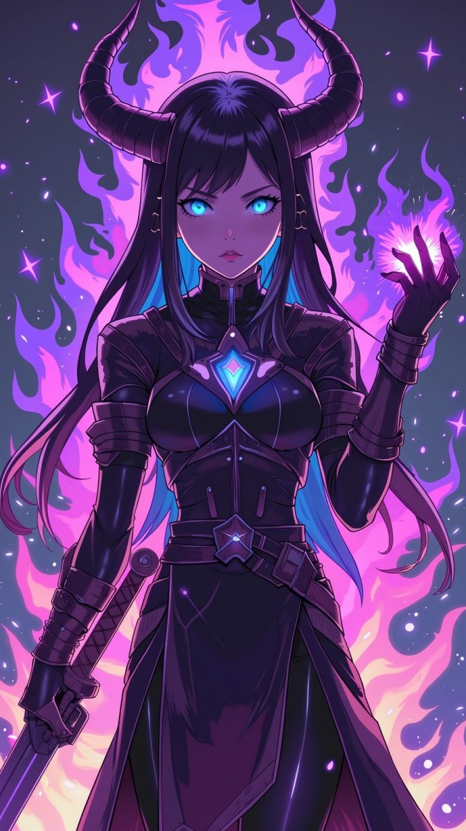 female character long dark hair blue eyes black outfit fierce expression holding sword right hand left hand raised battle horns glowing purple bg pink flames intense illustration#role_runeforge