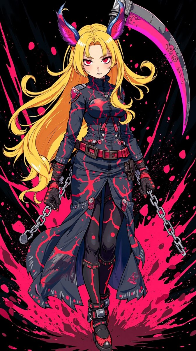 Могучий образ воплощенной силы и опасности. Перед зрителем предстает девушка с длинными светлыми волосами и пронзительными красными глазами, излучающая уверенность и решимость. Яркий неоновый наряд подчеркивает ее дерзкий характер и энергию. В правой руке она сжимает огромную серповидную косу, соединенную цепью – символ разрушения и перемен. Тёмный и зловещий фон, пронизанный вспышками алого и розового цветов, создает атмосферу напряженности и предчувствия. Выражение лица девушки полно силы и мощи, она будто готова бросить вызов всему миру. Черный фон акцентирует внимание на ее фигуре и усиливает драматизм композиции. Этот персонаж – не просто девушка, а олицетворение внутренней силы, способной сломать любые преграды и изменить ход событий. Ее взгляд полон решимости, а каждое движение наполнено скрытой энергией. Она – владычица своей судьбы, готовая к любым испытаниям