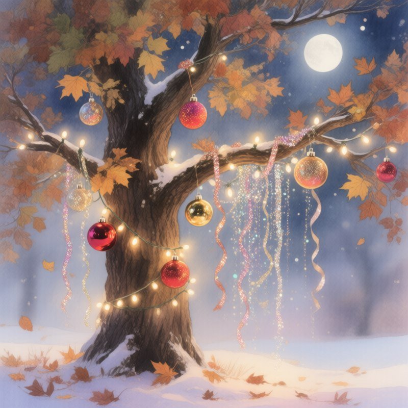 Render in a delicate watercolor style with soft pastel tones, an ancient oak tree adorned with lush autumn foliage. Its branches are entangled not only with brilliant Christmas baubles but also twinkling fairy lights that cast a gentle yet mesmerizing illumination throughout the night. Wisps of glittering tinsel cascade downwards, adding an extra layer of festivity as they catch the dazzle of both moonlight and electric bulbs alike. Amidst the rustling leaves and glowing ornaments, these strands of tinsel dance gracefully, enhancing the ethereal charm of the composition. Against a subtly blurred backdrop, the entire scene comes alive with war...