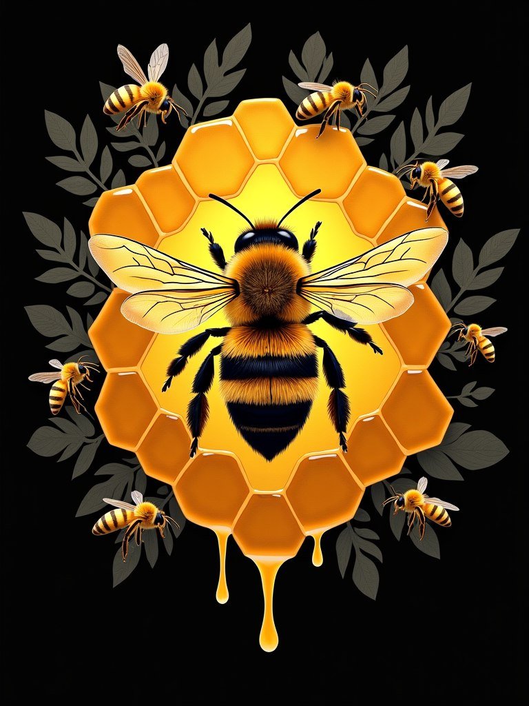 Восхитительная цифровая иллюстрация демонстрирует крупного пчелиного труженика в центре композиции, излучающего жизненную силу и трудолюбие. Его пушистый золотисто-жёлтый торакс контрастирует с чётко очерченным чёрно-жёлтым сегментированным брюшком, подчеркивая его анатомическую точность. Вокруг пчелы простирается стилизованная структура соты, выполненная в богатой палитре золотых и янтарных оттенков, создающая ощущение тепла и изобилия. Каждая гексагональная ячейка наполнена густым, блестящим, напоминающим мёд веществом, словно воплощая собой плоды неустанного труда пчел. На фоне глубокого чёрного пространства, которое усиливает яркость жёлтых и золотых цветов, разбросаны несколько более мелких пчёл, также выполненных с высокой детализацией, создавая ощущение динамичной пчелиной жизни. Тёмная стилизованная листва обрамляет сотовую структуру, добавляя глубину и текстуру композиции. Капли мёда стекают по сотам, привнося элемент движения и текучести в статичное изображение. Мягкое рассеянное освещение исходит изнутри сотового узора, создавая тёплую, манящую атмосферу, которая привлекает взгляд и вызывает чувство покоя. В целом, стиль иллюстрации является художественным и графичным, напоминающим постер или элемент дизайна, с чёткими линиями и плавными градиентами. Это произведение искусства – ода природе, трудолюбию и сладости, воплощённая в ярких цветах и детализированной проработке каждой линии. Изображение вызывает ощущение гармонии и вдохновляет на восхищение красотой окружающего мира