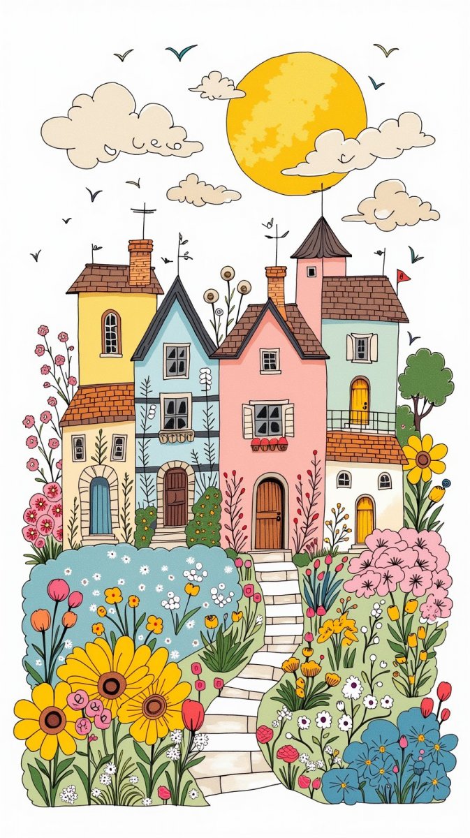 #2 illustration, ink drawing, naive art, doodling, zentangle, folk art, pastel colorful spring colors on a white background, clipart with fine lines clean and sharp in the style of j journalists, charming houses on the hillside with colorful flowers blooming around them a bright and soft light-colored background with a sense of cartoon pixar style #role_houses