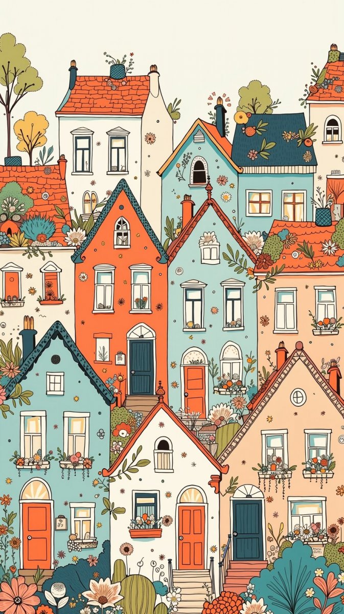 #1. ink drawing, whimsical houses adorned with vibrant flowers and playful patterns, capturing a cheerful urban landscape in pastel hues and folk art style, #role_houses