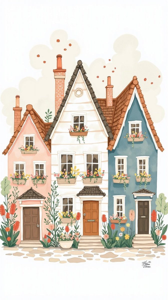 #4. folk art, cartoonish watercolor cottagecore cozy illustration of row houses with flowers, pastel colors on a white background, clipart with fine lines, evoking feelings of joy and happiness, clean and sharp in the style of johanna basford #role_houses