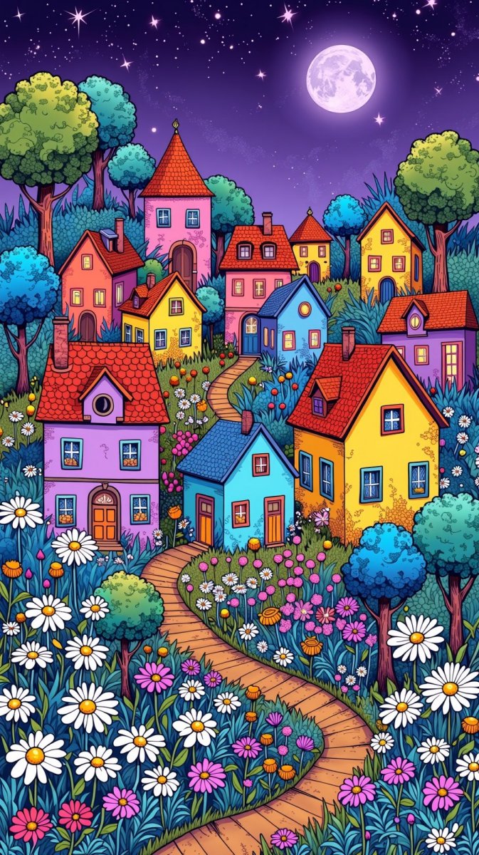 #3. doodling, zentangle a colorful cartoon village with houses and trees in the style of digital art, vibrant camomile and flowers, intricate details, fantasy house, purple sky at night #role_houses