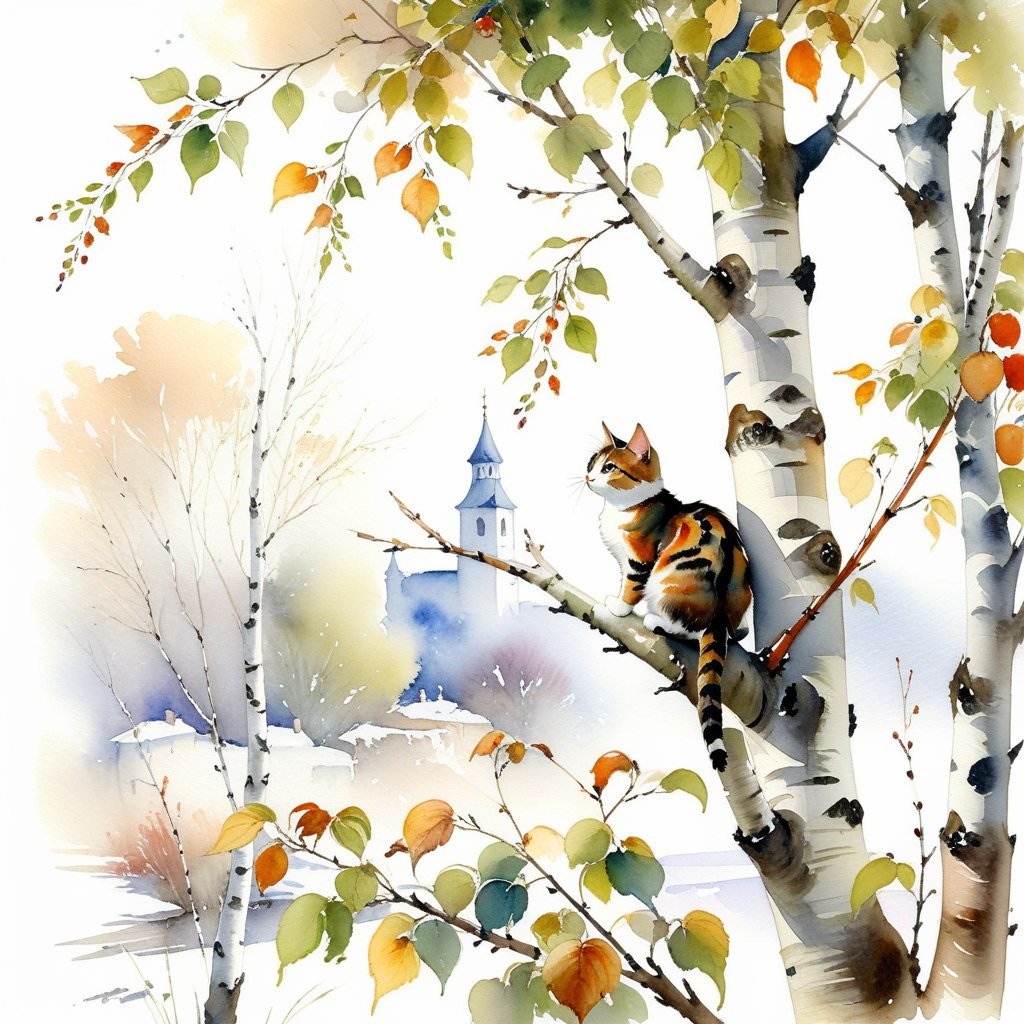 Изящная акварельная сцена, выполненная в английской манере с вниманием к деталям, напоминает работы Уильяма Стивенса Коулемана. На фоне белоснежного полотна, созданного приёмами смазанной техники (сфумато), раскинулся террасой вид на тихий уголок природы. В центре композиции – грациозный кот, застывший в ожидании, его взгляд устремлён на маленькую пташку-дроздика, удобно расположившуюся на ветке берёзы. Мягкий свет заливает сцену, создавая ощущение лёгкости и безмятежности. Детализированная прорисовка каждого элемента – от шерсти кота до тонких веточек берёзы – свидетельствует о мастерстве художника и его стремлении передать всю красоту окружающего мира. Эта картина воплощает гармонию между домашним уютом и дикой природой, предлагая зрителю насладиться моментом спокойствия и созерцания. Использование акварельных красок придает изображению воздушность и прозрачность, а тонкие переходы цвета создают ощущение глубины и объема. Вся композиция пронизана тихим очарованием английского пейзажа, где каждый элемент играет свою важную роль в создании единой гармоничной картины