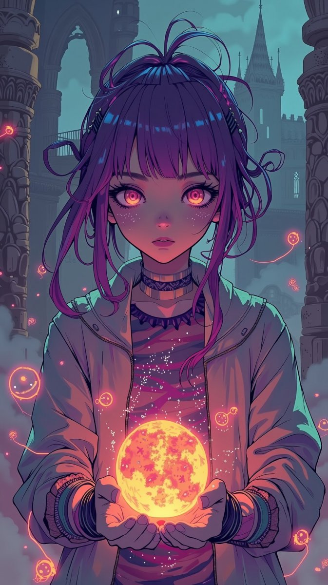 Загадочная юная особа с экстравагантной лиловой шевелюрой, украшенной светоотражающими браслетами, возвышается на фоне древнего готического замка, чьи стены хранят молчаливые истории веков. Её волосы играют переливающимися цветными бликами, словно отражая внутренний мир фантазий и грёз. Глаза девушки излучают неземной свет, наполненный таинственной силой и предзнаменованием неизведанного. В её руках покоится мерцающий шар, на поверхности которого пульсируют огненные узоры, словно заключённые в хрустальной клетке стихии. Вокруг неё танцуют призрачные огоньки – воплощение сновидений и мечтаний, которые растворяются в бескрайнем космическом пространстве, сливаясь с ним в единое целое. Загадочный туман окутывает фон, создавая атмосферу мистики и недосказанности, словно скрывая тайны, которые предстоит разгадать. Эта девушка – хранительница грёз, проводник между реальностью и фантазией, воплощение бунтарской энергии и непоколебимой веры в чудеса. Она стоит на пороге неизведанного, готовая отправиться в путешествие по самым дальним уголкам воображения, где возможно всё, а границы стираются без следа. Её образ – это квинтэссенция стиля и загадки, отражение внутреннего мира, полного ярких красок и неиссякаемой фантазии. Она словно сошла со страниц сказочной истории, чтобы поделиться с нами своим волшебным миром