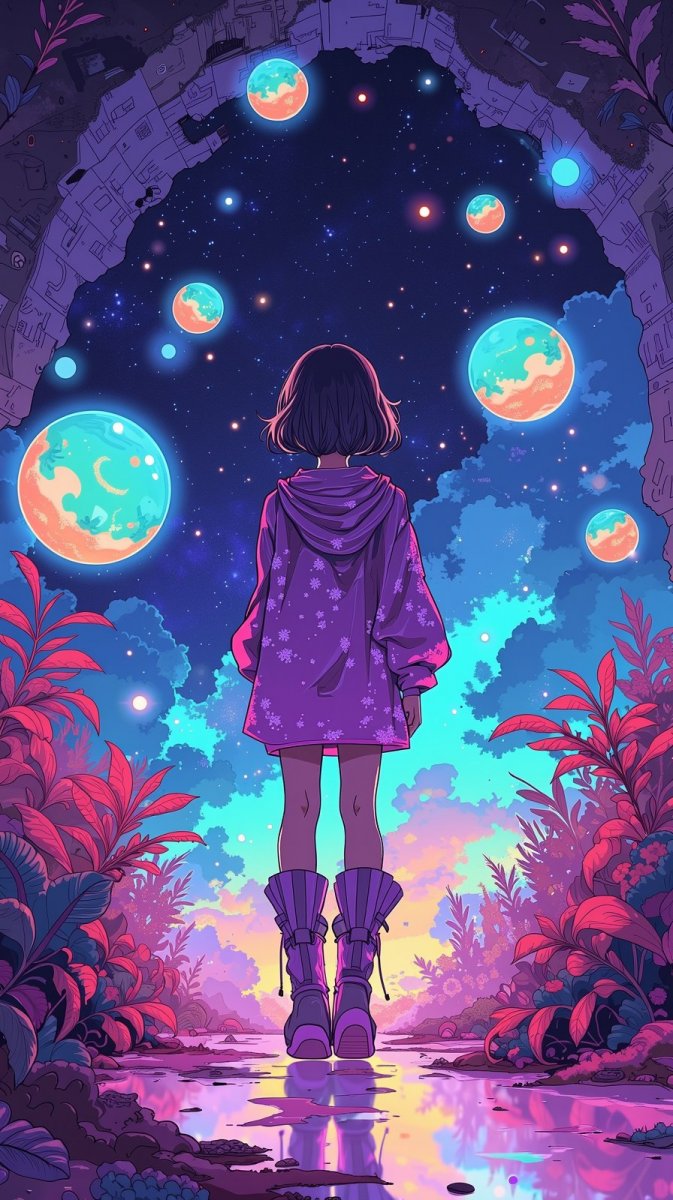 Загадочная девушка в фиолетовых космических ботинках и переливающихся блузках, напоминающих оперение попугая, парит над заброшенной станцией метро. Её окружает завораживающая картина: светящиеся растения создают эффект невесомости, а густые клубы тумана скрывают её облик. Внутри хрустальных сфер застыли размытые образы снов, словно осколки воспоминаний. Глубокий свет и мерцающие звезды на заднем плане формируют иллюзию безграничной свободы, создавая ощущение выхода за пределы реальности. Эта сцена – воплощение сюрреалистической красоты, где реальность переплетается с фантазией, а забытое пространство обретает новую жизнь в свете неземного сияния. Одинокая фигура среди космического великолепия, плененная в объятиях тумана и света, словно символ ускользающей мечты или поиска истины в заброшенном мире. Кажется, будто она – хранительница этого места, свидетельница ушедших эпох, окутанная тайной и волшебством. Её присутствие наполняет пространство мистической энергией, а переливы её наряда вторят сиянию звезд, создавая неповторимую атмосферу загадочности и очарования. Это визуальное произведение искусства – путешествие в мир грёз, где границы стираются, а воображение обретает свободу