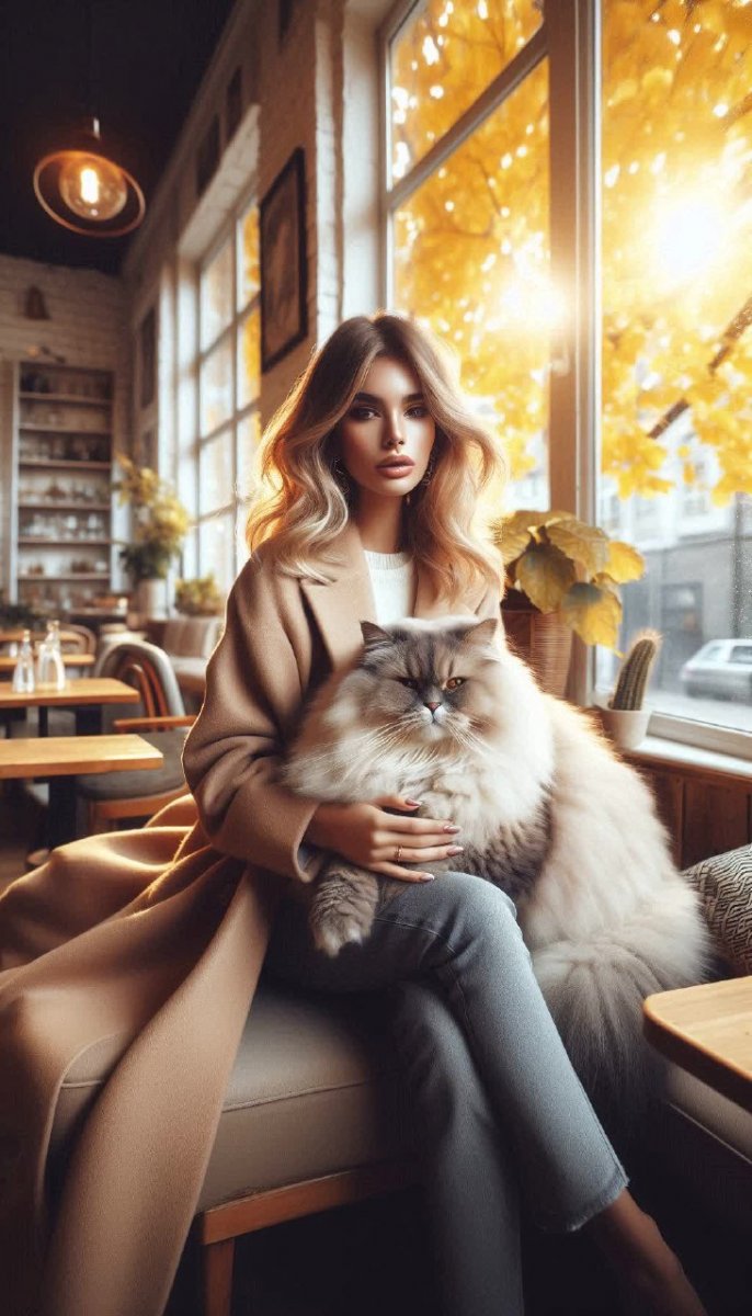 Осеннее настроение: кэжуал шик в уютном кафе с кошкой на коленях - Пример работы нейросети Dalle