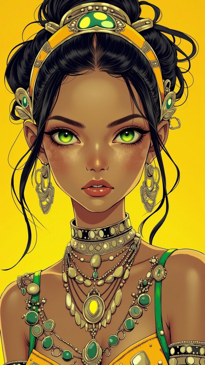 #1 fashion model with striking emerald eyes gazing directly at the viewer, decorated with intricate metallic body jewelry reflecting the vibrant colors of the bright solid background, rendered in a photorealistic style using a canon eos 5d mark iv with a 85mm f/1.2 lens, capturing the depth of emotions in her expression, while the seamless blend of elegance and modernity creates a captivating visual narrative. #role_girls