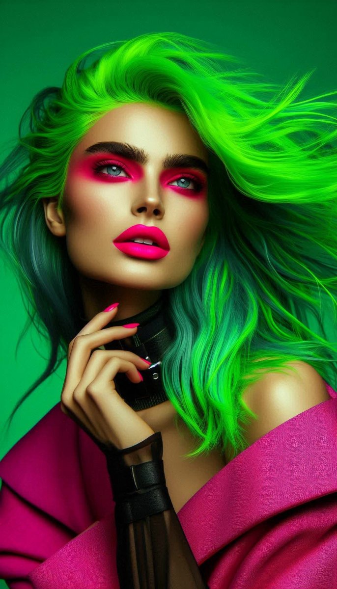 #1. fashion model with radiant cerise lips and striking neon green hair, showcasing a dynamic pose against a bright solid background, her piercing gaze locked onto the viewer, clad in an avant-garde outfit that seamlessly merges traditional and modern elements, capturing the vividness of neon shades, photograph captured with a Canon EOS R5 and RF 50mm f/1.2L lens. #sp_neon