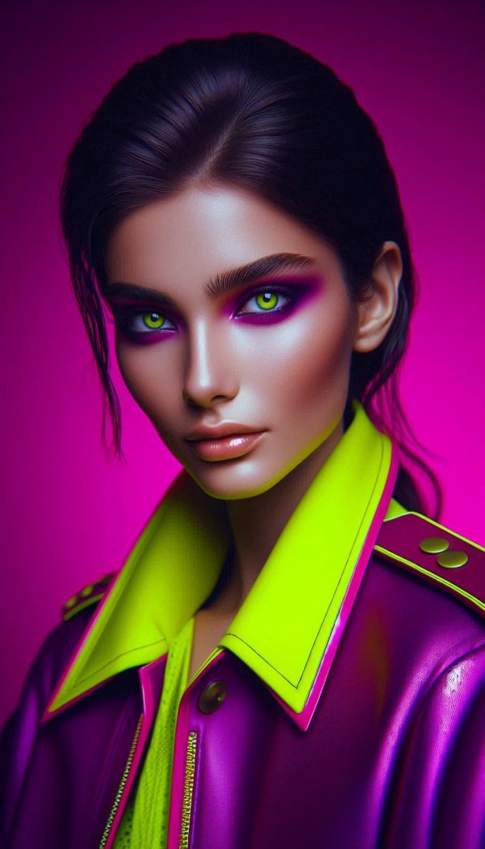 #2. portrait of a fashion model with fluorescent yellow and vivid purple attire, her bold neon green eyes looking intensely at the viewer, situated against a smooth radiant magenta backdrop, shot using a Nikon Z7 II with a NIKKOR Z 50mm f/1.8 S lens, ensuring sharp and dynamic details. #sp_neon