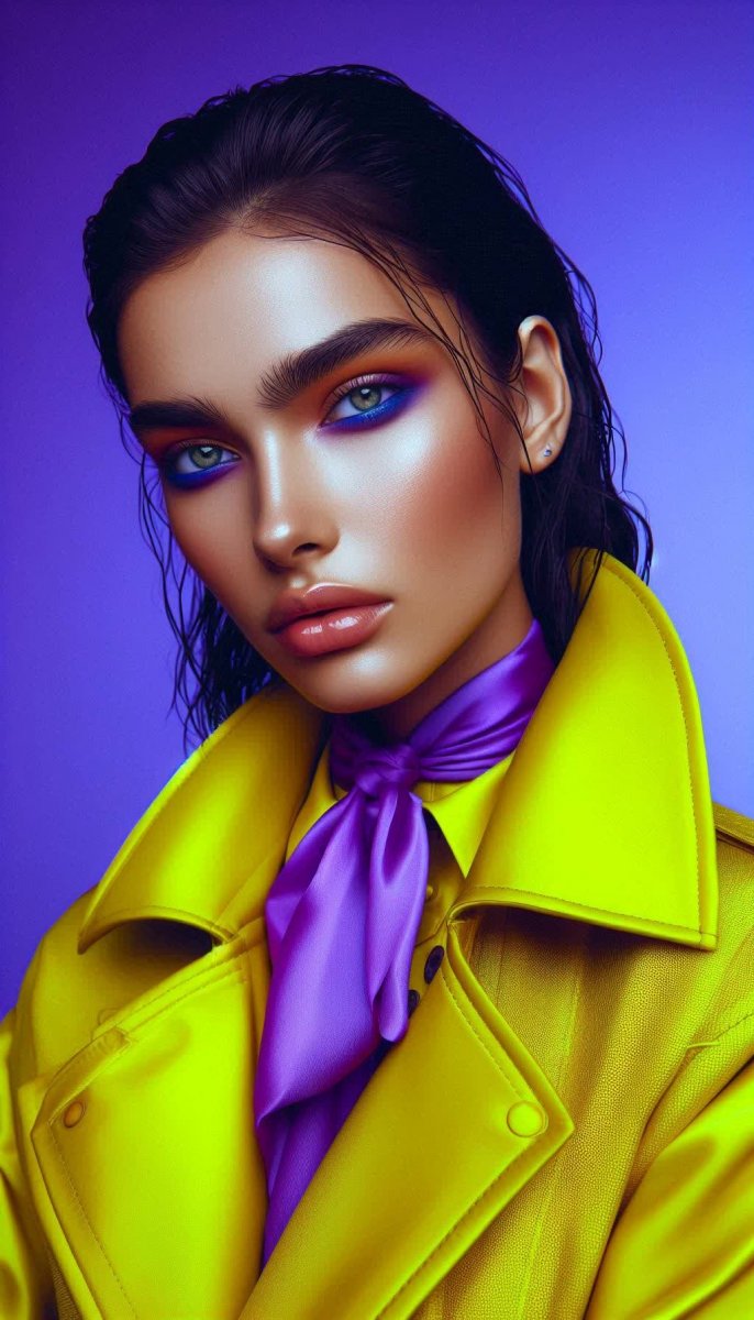 #5. stunning portrait of a fashion model in fluorescent yellow and vivid purple attire, her expressive eyes meeting the viewer's gaze, set against a bright solid background that enhances her striking presence, shot with a panasonic lumix s5 and 50mm f/1.4 lens, resulting in a visually arresting composition that celebrates artistic boldness. #sp_neon