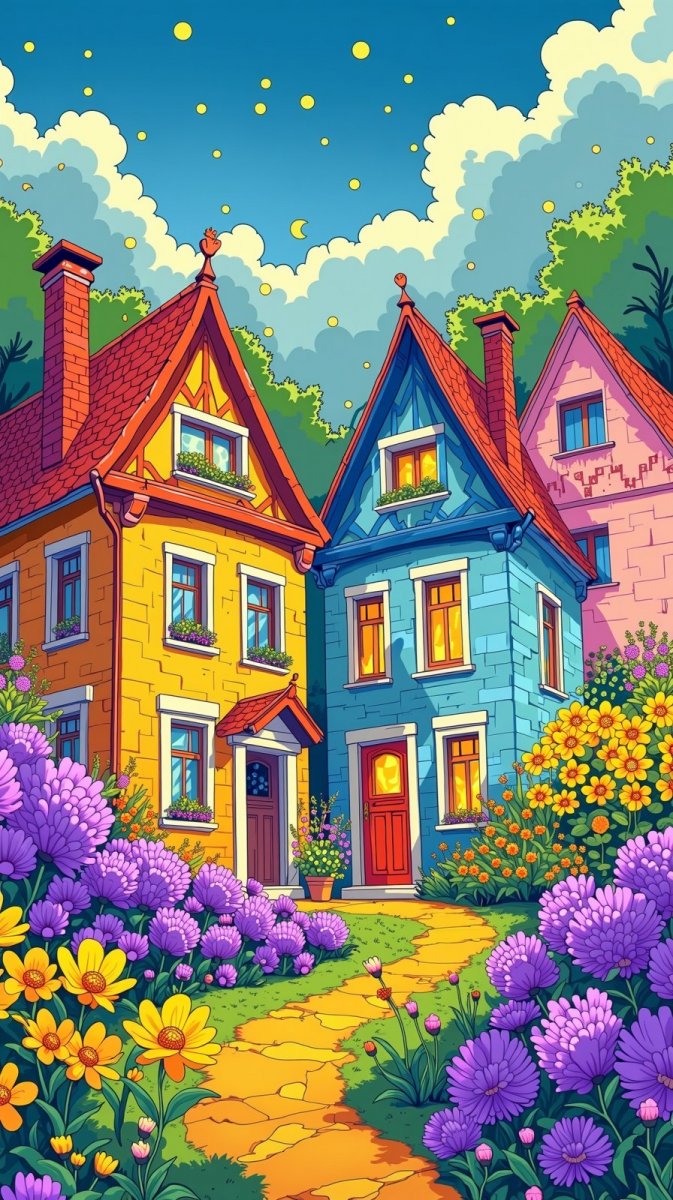 #2. illustration, vibrant cartoon houses surrounded by fluorescent yellow and vivid purple flowers, showcasing intricate details and a cheerful ambiance reminiscent of fairy tales. #sp_neon
