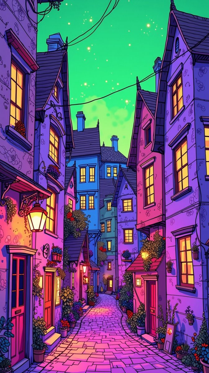 #3. doodling, quirky town with buildings of electric purple and neon green, adorned with joyfully colored windows and charming paths, exuding a sense of warmth and creativity. #sp_neon