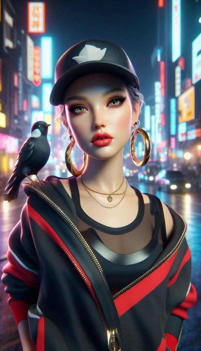 #5. креативная девушка в обтягивающем черном топе, спортивные леггинсы и яркие ботинки, на ухе большие серьги-колечки, красная помада и выразительные глаза, рядом с ней черная воробейка, вокруг — яркие неоновые огни города. #role_real