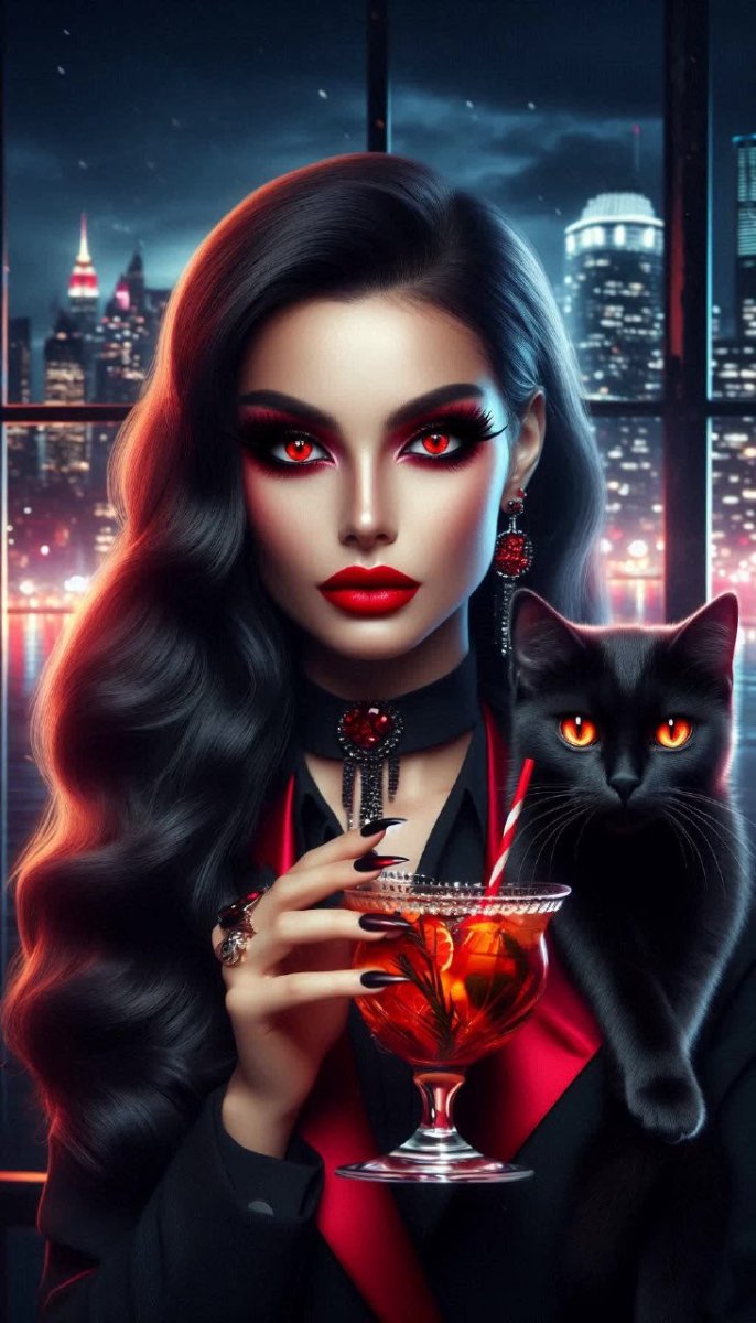 Загадочная ночная сцена, сотканная из дерзкой элегантности и мистической атмосферы. На фотографии запечатлена роковая брюнетка в стильной черно-красной кожаной куртке, чья красота подчеркнута яркими алыми губами и выразительными длинными черными ресницами. В ее руках – чашка с манящим демоническим коктейлем, словно символ запретных удовольствий и скрытых желаний. Рядом с ней, как верный спутник, примостился черный кот с пронзительными красными глазами, добавляющий изображению нотку таинственности и сверхъестественного. Мягкое свечение неоновых огней городского пейзажа на фоне создает ощущение погружения в альтернативную реальность, где красота переплетается с опасностью, а роскошь – с мистикой. Это не просто портрет, это история, рассказанная взглядом и жестом, обещание приключений и неизведанных тайн. Каждая деталь, от блеска кожи куртки до игривого взгляда кота, создает неповторимую атмосферу интриги и соблазна. Фотография словно приглашает зрителя окунуться в мир ночных грёз и открыть для себя секреты этой очаровательной роковой женщины. Она выглядит уверенной в себе и готовой к любым испытаниям, воплощая образ современной богини тьмы. Этот портрет – настоящий шедевр, сочетающий в себе красоту, стиль и мистику