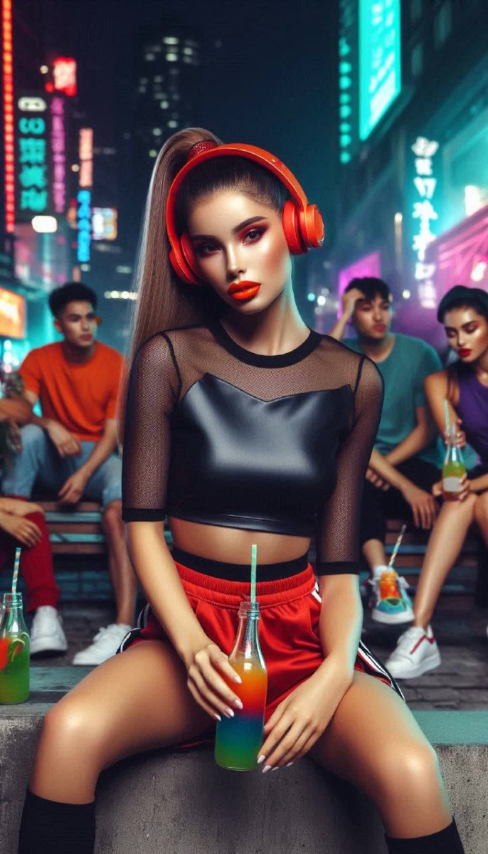 #3. Уличное модное шоу, спортсменка в черной майке и красных шортах, массивные наушники, яркие губы, длинные волосы в хвосте. В руках стеклянная бутылка с ярким безалкогольным коктейлем, вокруг вечерний неоновый город и кучка друзей, сидящих на скамейке. #role_real