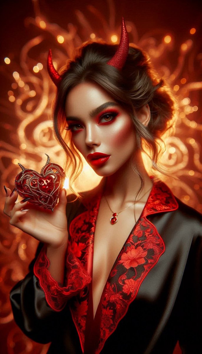 #4. Гламурная вампирша в черной и красной пижаме, с ярко-красной помадой, раскрасненные щеки, в руках демоническое сердце, сверкающее под светом потом. На голове красные рога, светящийся фон с абстрактными узорами. Профессиональная фотография, смягченные контуры. #role_real