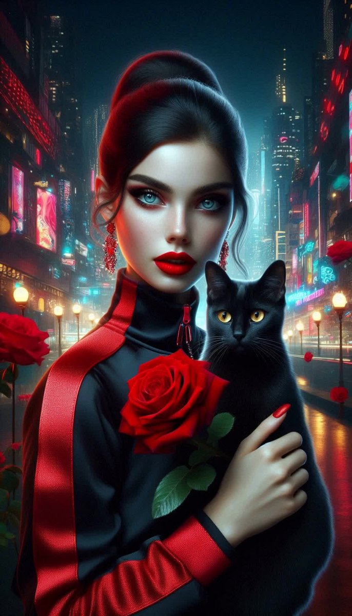 #5. профессиональная фотография, загадочная девушка в черно-красном спортивном костюме, красная помада, в ухе яркие серьги, в руках черный демонический кот и роза, посреди яркого ночного города, с элементами абстрактного искусства и ретро-эффектами, эмоциональный стиль. #role_real