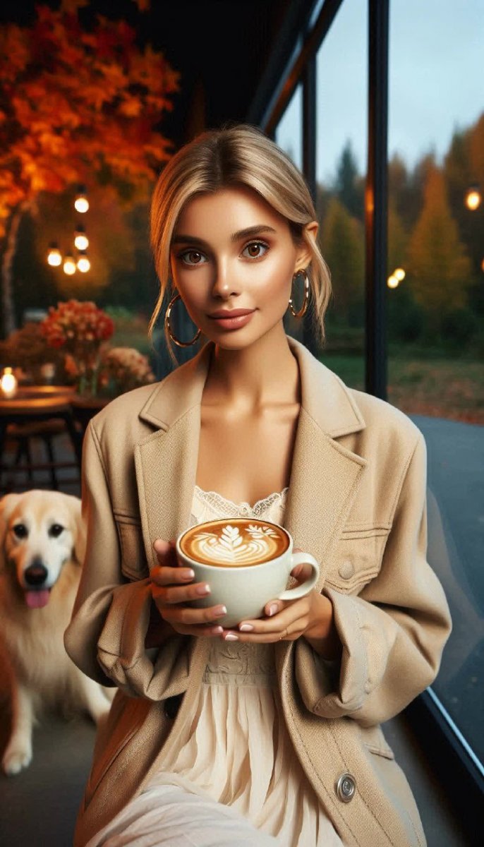#2. осенний вечер в кафе, уютный стиль: вязаное платье кремового цвета, легкая куртка хаки, минималистичные серьги-кольца, естественный макияж с акцентом на глаза, на руках - чашка латте с рисунком из пенки, рядом — золотистый ретривер, фон — большие окна с видом на осенний лес, двойная экспозиция #role_autumn