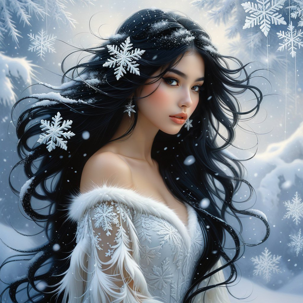 Завораживающая зимняя сказка, сотканная из нежности и графической элегантности. В центре композиции – юная девушка с ниспадающими струями длинных черных волос, обрамляющих ее лицо, подчеркнутое длинными густыми ресницами, словно прикосновение ночного ветра. Вокруг нее, в легком танце кружатся изящные снежинки, вырезанные с филигранной точностью, создавая ощущение хрупкости и мимолетности момента. Стиль изображения пронизан духом минимализма, отсылая к творчеству таких мастеров как Ли Богл, Эндре Пеновац, Анна Силивончик, Татьяна Маркова и Барбара Такенага. Их влияние проявляется в плавных линиях, гармоничном сочетании цветов и акценте на детали, превращая картину в настоящую поэзию визуального искусства. Это не просто портрет – это воплощение зимней красоты, утонченности и внутренней гармонии, где каждая деталь служит для создания неповторимой атмосферы волшебства и мечтательности. Работа излучает спокойствие и созерцательность, приглашая зрителя погрузиться в мир фантазий и эстетического наслаждения, ощутить дыхание зимы и красоту простоты. Картина завораживает своей сдержанностью и глубиной, оставляя после себя ощущение чистоты и обновления
